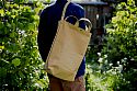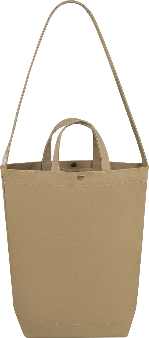シンプルで丈夫なウェザープルーフキャンバスに、深い内側ポケット、底にはタフなPVC素材の内張り、ハンドストラップに加えて、ショルダーストラップもついています。シンプルなボタンの開け閉めで、悪天候から守り、大根を入れることもできます。ローカルのファーマーズマーケットではいつも大活躍。