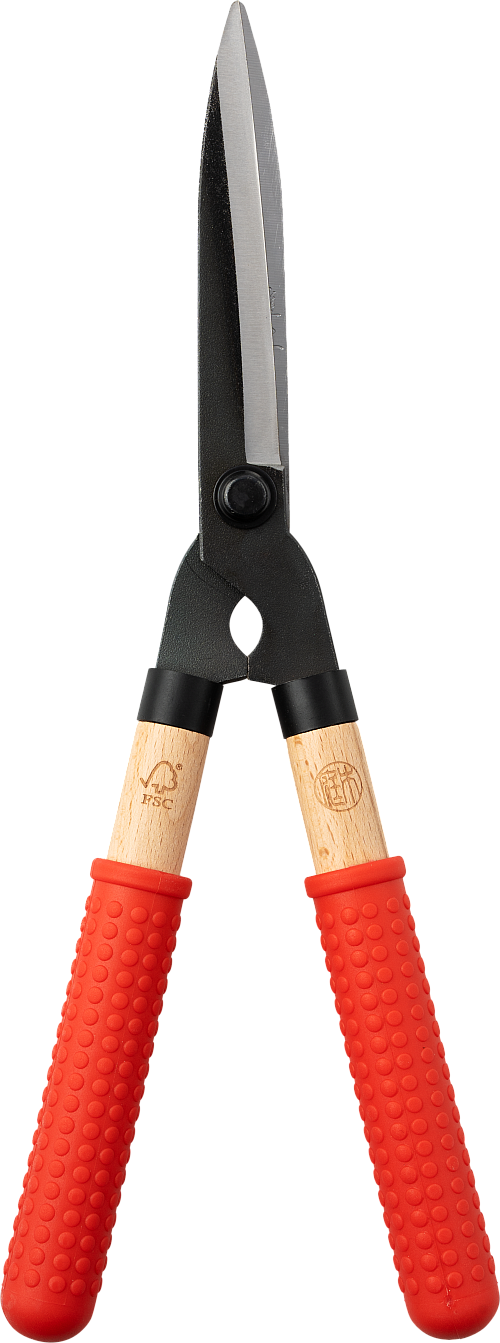 ミニ作業用のミニ刈り込みばさみ。狭い場所や小さいサイズのトピアリー、芝生の縁取りなど、微調整が必要なシーンに最適です。オークハンドルの上にビビットな赤いラバーグリップがついているので、滑りにくいです。